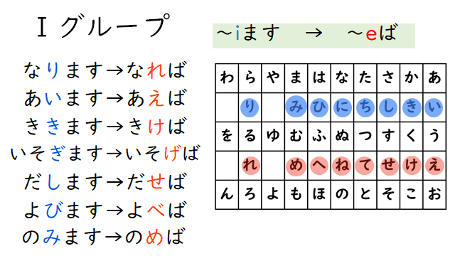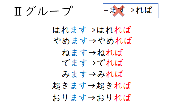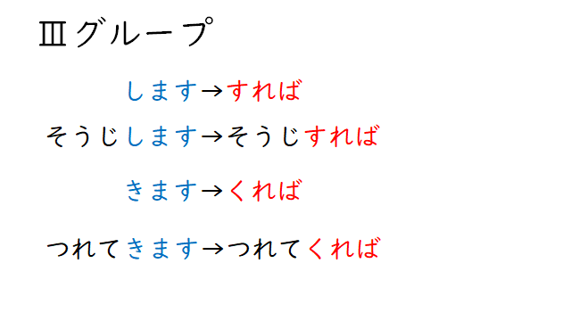 | 1グループ | 語幹+eば 例:行く→行けば |