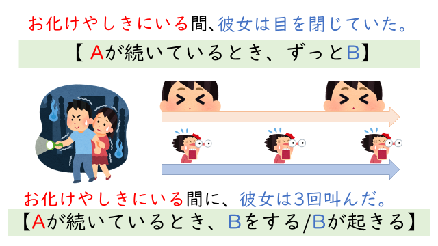 • 〜間:A の期間中、B も「ずっと」続く。